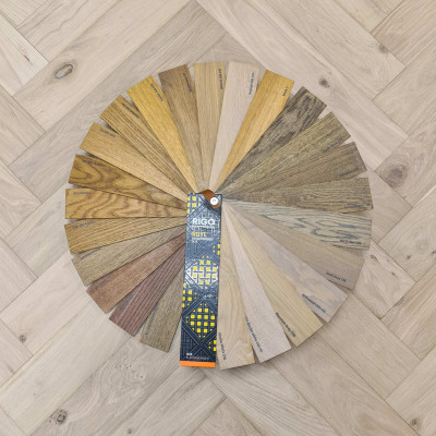 Wij hebben een ruim assortiment aan kleuren die toegepast kunnen worden op een eiken houten vloer. De kleurwaaier is te zien op de foto.