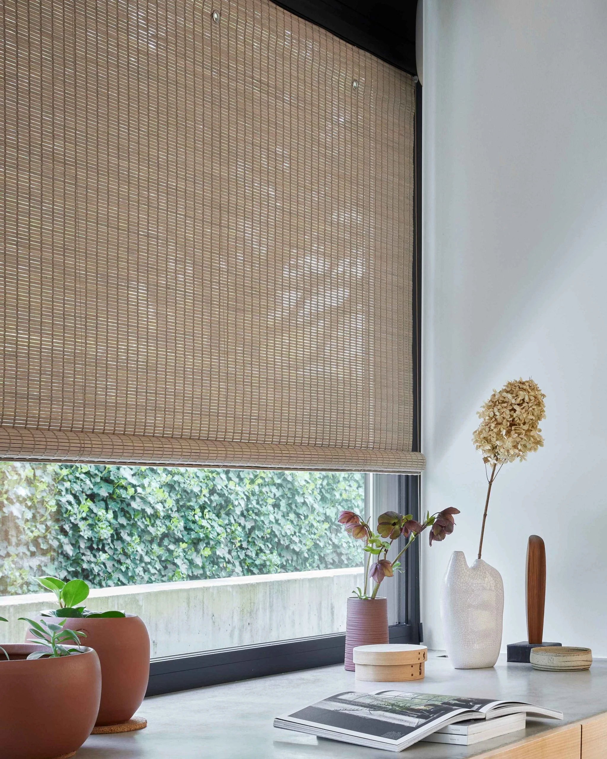 De vouwgordijnen of rolgordijnen van geweven hout zijn in verschillende kleuren verkrijgbaar. Zo hebben we de basiskleuren zoals zwart, wit en naturel. Maar ook de hedendaagse kleuren beton en mos groen zijn te vinden in onze collectie.